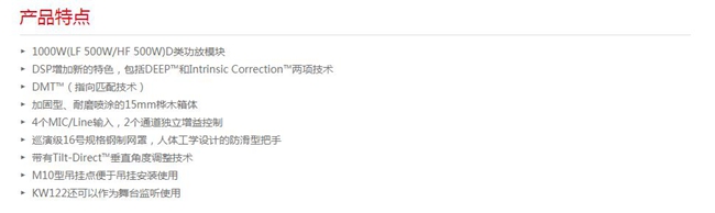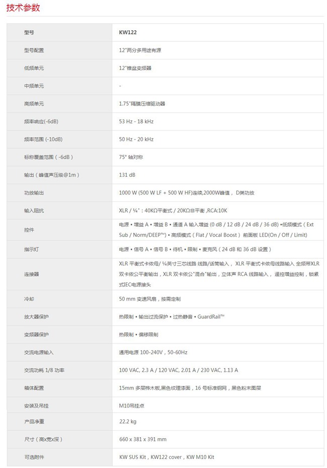 KW系列揚(yáng)聲器在獲得一致好評的K系列的基礎(chǔ)之上采用了高品質(zhì)的樺木箱體,四款型號均采用1000WD類功放模塊,DSP增加新的特色,包括DEEP?和Intrinsic Correction?兩項(xiàng)技術(shù),提高性能表現(xiàn)。DMT?(指向匹配技術(shù))保證聲源內(nèi)各個(gè)頻段指向協(xié)調(diào)一致。其中三款全頻型號帶有4個(gè)MIC/Line輸入接口,2個(gè)通道的獨(dú)立增益控制,采用巡演級16號規(guī)格鋼制網(wǎng)罩,人體工學(xué)設(shè)計(jì)的防滑型把手,帶有Tilt-Direct?垂直角度調(diào)整技術(shù)的35mm插孔裝置,可選0°-7.5°的下傾斜角度,為固定使用,可使用M10型螺栓吊環(huán)(額外選購)來懸吊KW181實(shí)現(xiàn)吊裝應(yīng)用,KW122還可以作為舞臺監(jiān)聽使用。KW181是一款樺木箱體的單18"低頻補(bǔ)聲音箱,峰值聲壓可達(dá)135dB,低頻下限37Hz,附贈的M20型支桿可以配合KW全頻音箱使用。